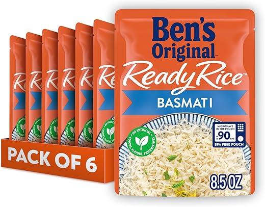 - Six 8.5 oz pouches of BEN’S ORIGINAL Ready Rice Basmati Rice